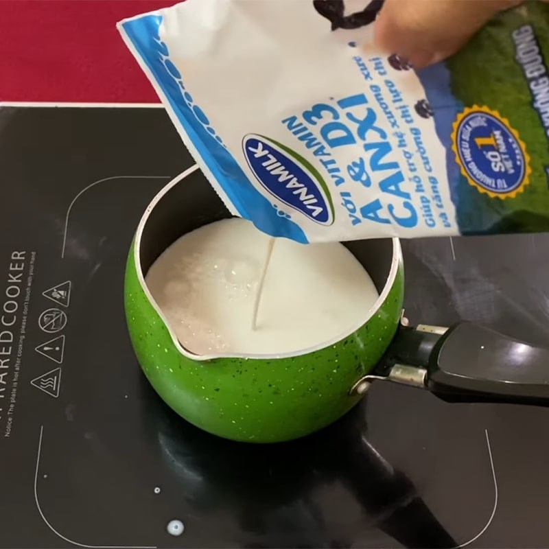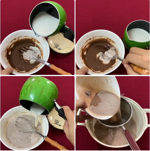 Sau khi khuấy bột xong, bạn cho sữa tươi đun nóng vào. Bạn cho từng chút sữa vào, vừa cho sữa vừa khuấy đều cho đến khi hết phần sữa tươi. Tiếp đó, bạn mang hỗn hợp sữa này lọc qua rây cho mịn.