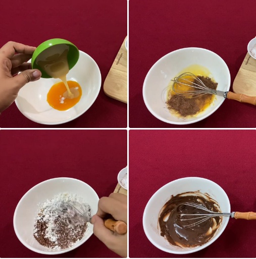 Trộn 2 lòng đỏ trứng gà cùng với đường rồi khuấy lên thật đều đến khi đường tan hết nhé. Sau đó chúng ta thêm bột bắp, sữa tươi và socola vào cùng luôn rồi khuấy đều lên tiếp. Rất đơn giản vì các gia vị đã được định lượng sẵn rồi mà.