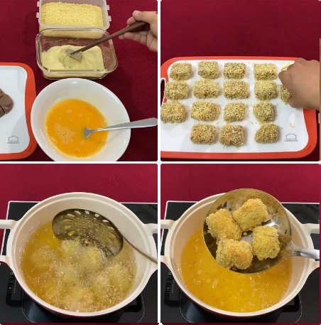 Tiếp theo, bạn cho từng miếng bánh vào tô trứng đều phủ kín cách mặt bánh. Sau đó bạn cho vào hộp đựng bột chiên xù đậy nắp lắc đều. Làm các bước tương tự như vậy thêm một lần nữa hết tất cả số bánh.