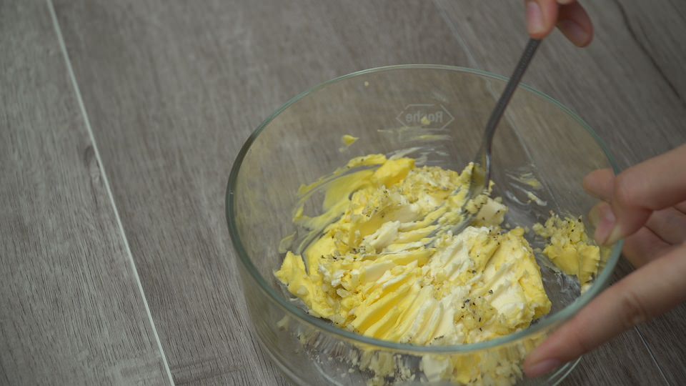 Trộn lượng phô mai tùy sở thích, thêm 50gr bơ lạt, 10gr tỏi băm, 1 muỗng tiêu đen xay, 1 muỗng hạt nêm, lấy muỗng hoặc xiên trộn đều.