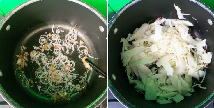 Cho vào nồi 2 muỗng canh dầu ăn, đun nóng dầu rồi cho hành tím vào phi thơm vàng. Sau đó bạn cho tiếp măng và xương heo vào, xào đều khoảng 1 phút với lửa vừa.