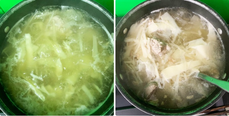 - Măng sau khi sơ chế bạn mang đi luộc chung với nước lá rau ngót cho đến khi măng chín mềm, vớt ra cho vào ngâm với nước lạnh trong khoảng 5 phút, rồi xả lại 2 - 3 lần với nước sạch.