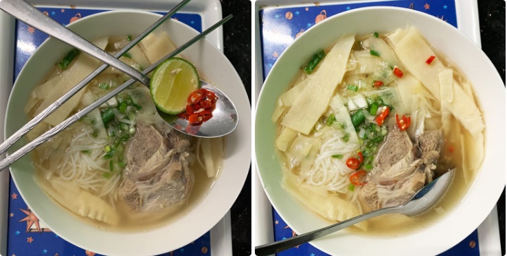 Cho bún vào tô, chan ngập nước dùng, có thể thêm ớt, chanh và hành lá tùy thích và thưởng thức thôi.