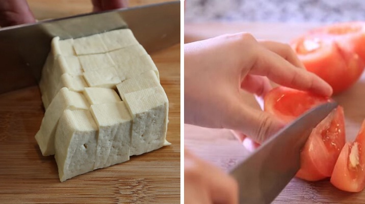 - Đậu hũ cắt đều thành những miếng nhỏ vừa ăn.