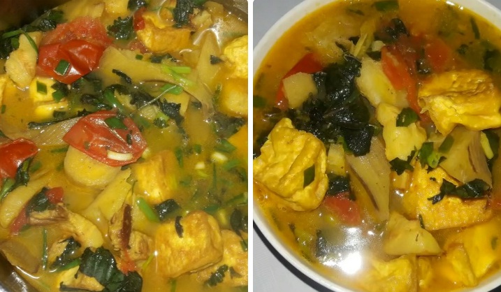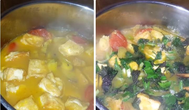 - Đến khi chuối đã mềm, bạn cho tiếp đậu hũ chiên vào nồi rồi đun thêm khoảng 3 phút cho đậu hũ thấm vị thì bạn cho hành lá, tía tô, mùi tàu thái nhỏ vào nồi, khuấy đều.