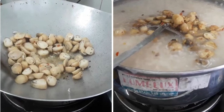 - Bắc chảo lên bếp và cho 1 muỗng canh dầu ăn vào chảo, khi dầu nóng thì cho 1/2 muỗng canh tỏi băm vào phi thơm, sau đó cho nấm vào xào, nêm vào 1/3 muỗng cà phê muối, xào đều nấm khoảng 2 - 3 phút thì vớt nấm ra cho vào nồi cháo.