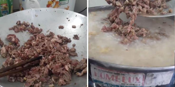 - Tiếp tục cho bò vào chảo, xào đều trên lửa vừa khoảng 3 phút đến khi bò chín tới thì tắt bếp, cho bò vào nồi rồi khuấy đều cháo.