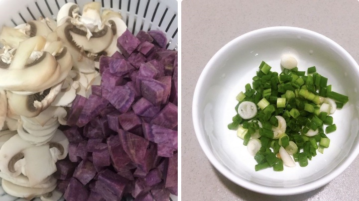 - Thịt sườn heo rửa sạch rồi trụng sơ qua nước sôi để khử mùi hôi. Khoai lang tím bạn dùng dao gọt sạch phần vỏ của khoai rồi rửa sạch lại với nước sau đó cắt hạt lựu.