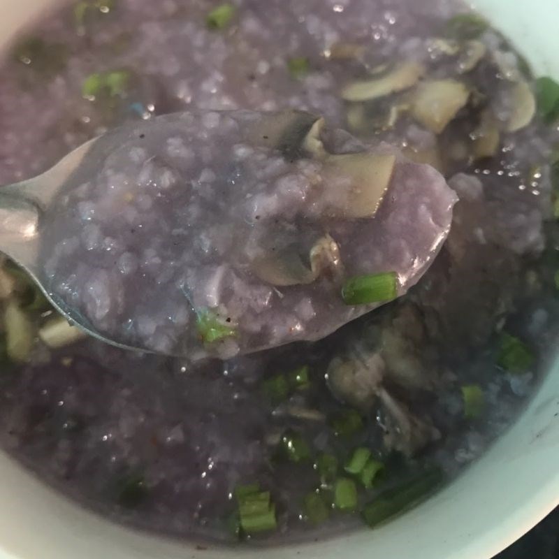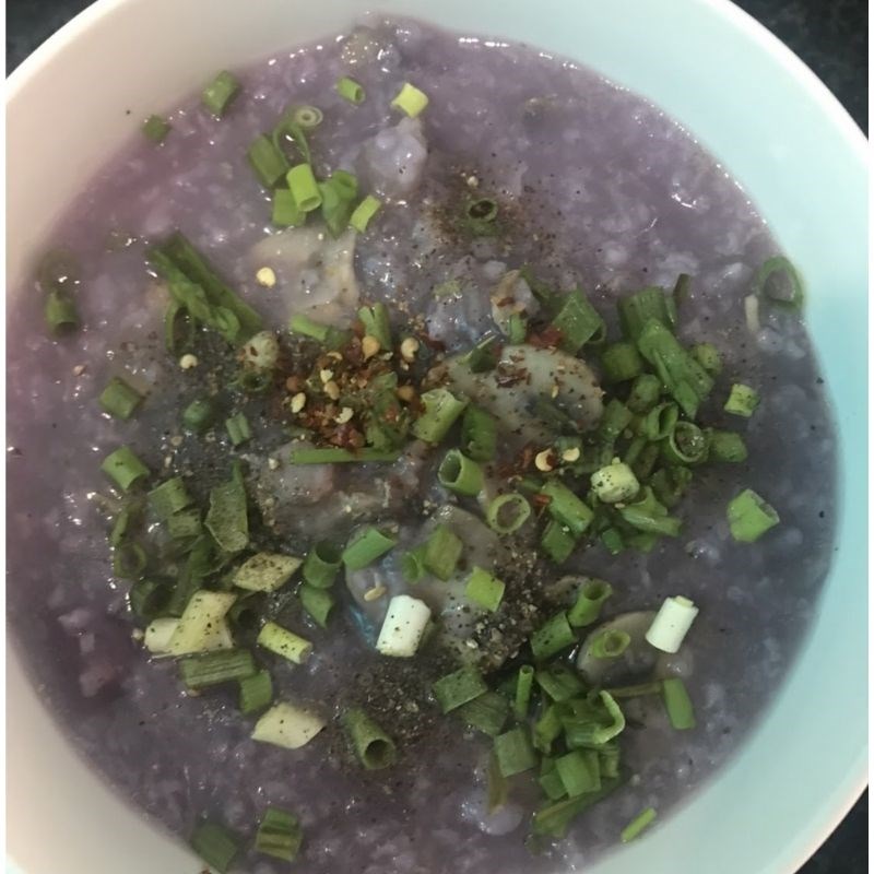 Cháo khoai lang tím có màu tím tự nhiên từ khoai, hạt cháo nở mềm, thịt sườn mềm, nấm ngọt thanh và vẫn giữ được vị giòn. Khoai hầu như đã mềm và hòa lẫn với cháo, khi thưởng thức ngẫu nhiên vẫn cảm nhận được vài miếng khoai vẫn còn đó, bùi béo.