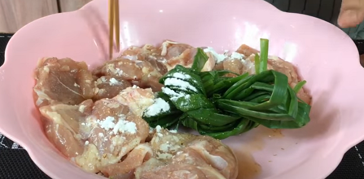 Lưu ý: Bạn có thể dùng tay sạch để trộn đều hỗn hợp và nhất là bóp phần bó hành để cho chất trong hành được tiết ra thấm vào gà giúp gà mềm và ngon hơn.