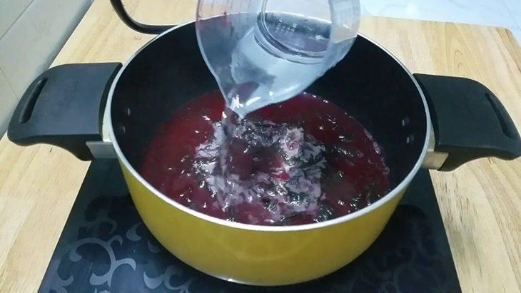 Bạn đun sôi chừng 300ml nước lọc trong nồi. khi nước sôi thì cho lá cẩm vào đun với lửa nhỏ trong vòng 10 – 15 phút rồi lọc qua rây để thu được nước lá cẩm màu đỏ lần 1.