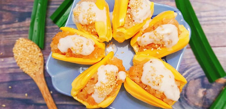 Bạn đợi xôi nguội thì lấy xôi dồn vào múi mít, quét 1 lớp nước cốt dừa, rắc dừa nạo và mè rang lên. Và bắt đầu thưởng thức.