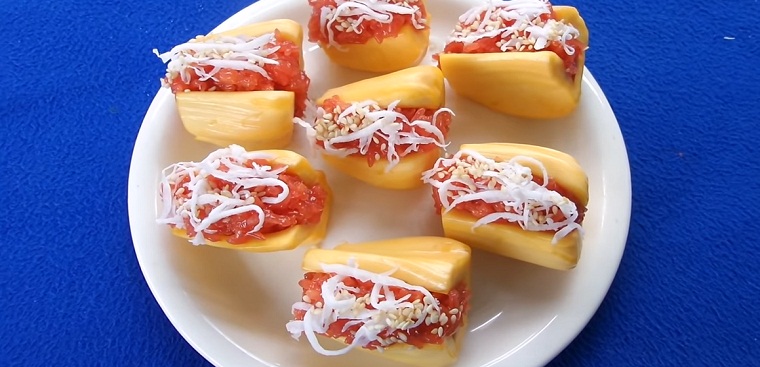 Múi mít bạn xẻ một bên, bỏ hạt mít. Múi mít sau khi bỏ hạt được dùng để dồn xôi sau khi nấu chín vào.