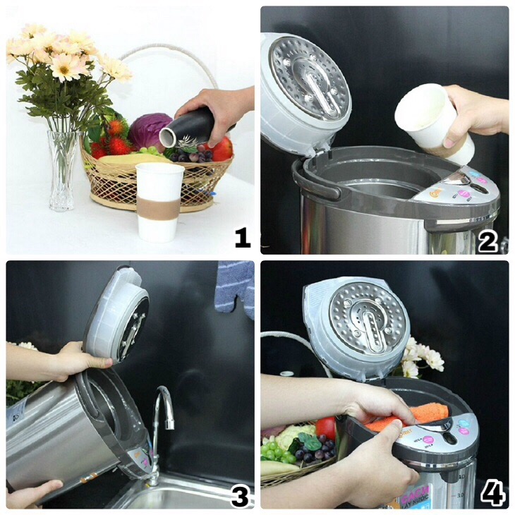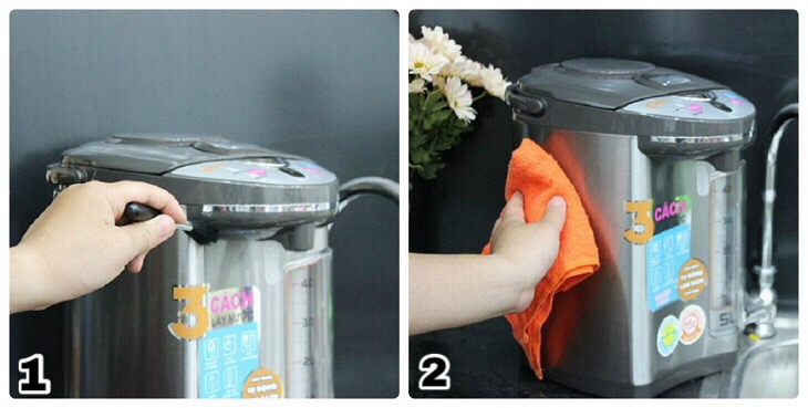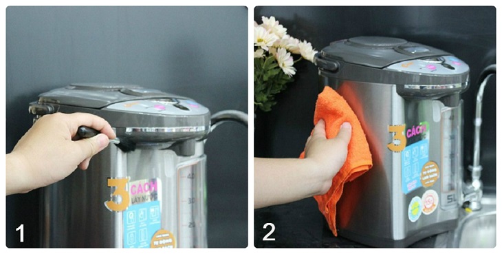 Bước 1: Trước khi vệ sinh bình thủy điện, hãy đảm bảo rằng phích cắm đã được tháo ra, bình thủy nguội hoàn toàn và không có nước trong bình.