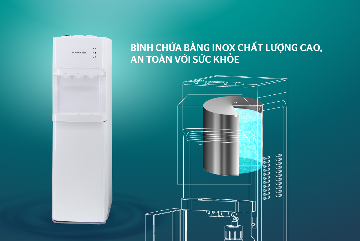 Bình chứa nước của cây nước nóng lạnh SUNHOUSE SHD9633 được làm từ chất liệu Inox cao cấp SUS304 – đây là loại Inox được đánh giá sở hữu nhiều cái “nhất” nhất: tốt nhất, đẹp nhất, đắt nhất… và tuyệt đối đảm bảo sức khỏe cho người sử dụng.