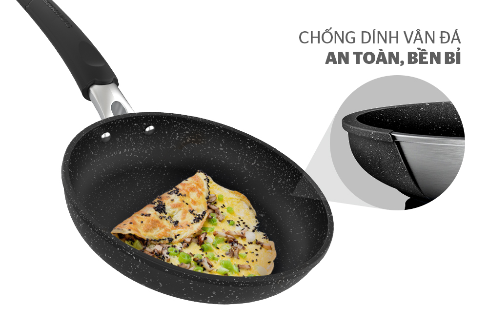Sản phẩm sử dụng chống dính vân đá có độ bền bỉ tối ưu. Nhờ đó, bạn có thể giảm đi một lượng đáng kể dầu mỡ khi chiên xào mà không cần e ngại thực phẩm dính sát vào lòng chảo. Lớp chống dính dày dặn này cũng đảm bảo an toàn sức khỏe cho cả gia đình.