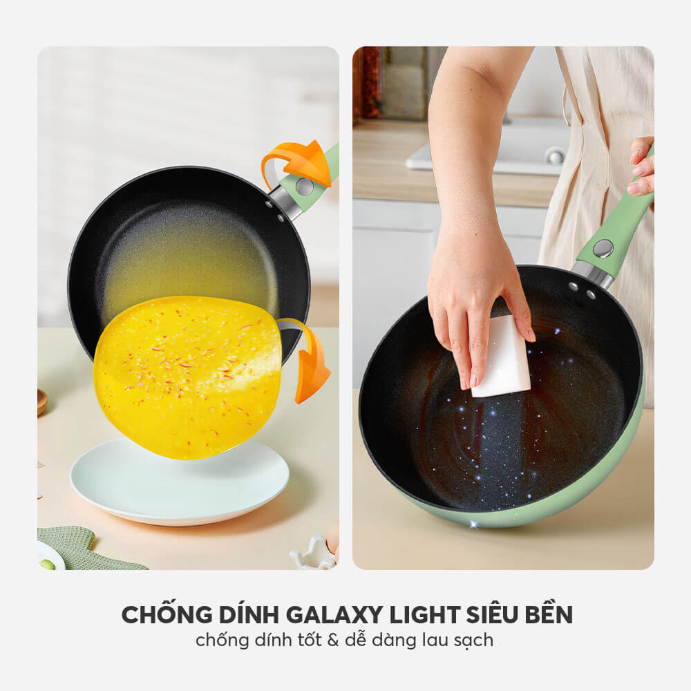 – Phía trong phủ chất chống dính siêu bền Galaxy light C3 dùng được các loại dụng cụ bằng kim loại khi nấu
