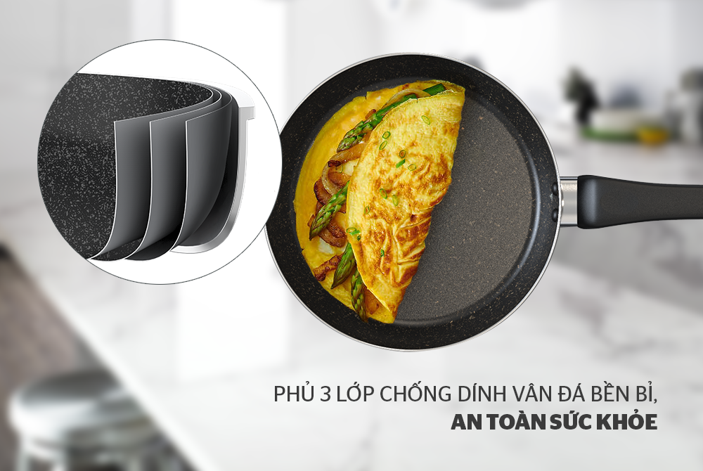 Sản phẩm sử dụng chống dính vân đá có độ bền bỉ tối ưu. Nhờ đó, bạn có thể giảm đi một lượng đáng kể dầu mỡ khi chiên xào mà không cần e ngại thực phẩm dính sát vào lòng chảo. Lớp chống dính dày dặn này cũng đảm bảo an toàn sức khỏe cho cả gia đình.