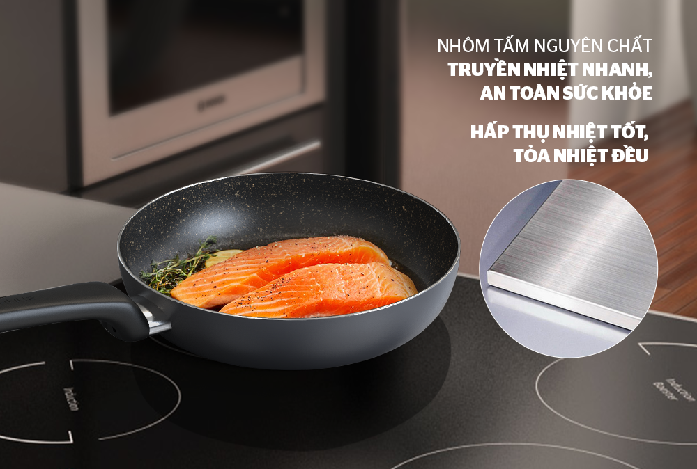 Được làm từ nhôm tấm cao cấp nguyên chất với độ dày 2.1mm hợp lý, chảo có khả năng bắt nhiệt nhanh chóng, lan tỏa nhiệt trải khắp toàn bộ chảo giúp thức ăn chín nhanh mà vẫn giữ nguyên được hàm lượng vitamin và dưỡng chất thiết yếu.