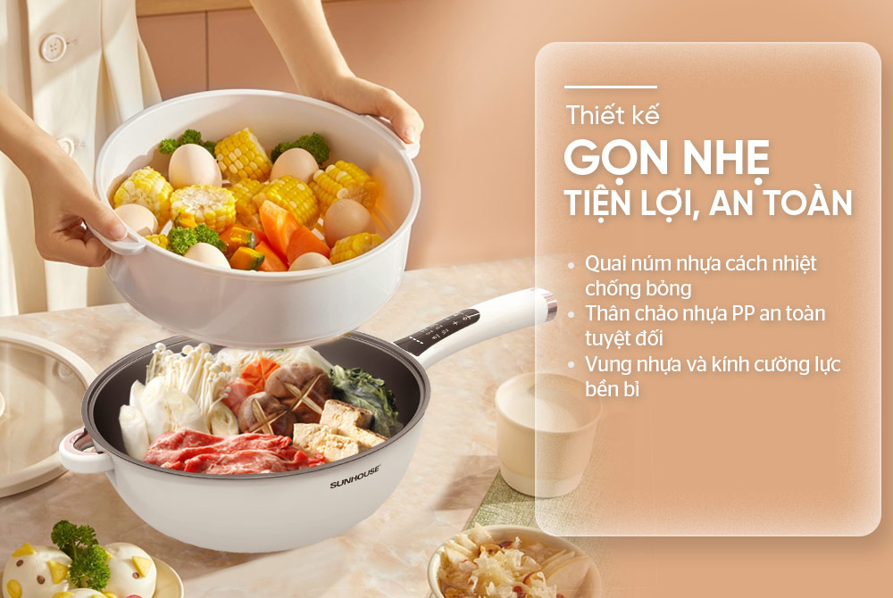 Ăn lẩu tại gia ngày càng trở nên quen thuộc với các gia đình Việt. Không những đổi vị bữa cơm gia đình, quây quần bên nồi lẩu còn là khoảng thời gian vàng để các thành viên thêm gắn kết. Thấu hiểu được nhu cầu đó, SUNHOUSE cho ra đời Chảo điện đa năng 5L SUNHOUSE SHD4555 với thiết kế trang nhã và công suất nấu mạnh mẽ, chế biến được nhiều loại thức ăn khác nhau, sử dụng đơn giản, tiện dụng hơn cho công việc nội trợ.
