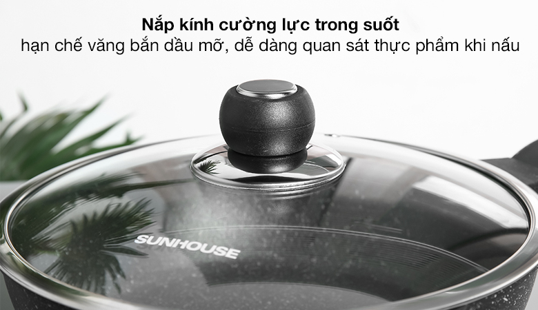 Chảo kèm nắp bằng kính cường lực trong suốt hạn chế văng bắn dầu mỡ, đảm bảo vệ sinh xung quanh bếp