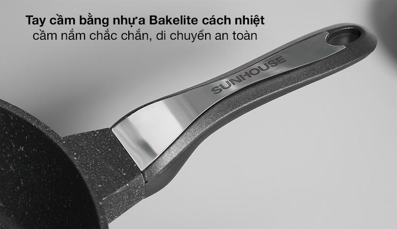 Chảo có khối lượng 1.95 kg, tay cầm bằng nhựa Bakelite cách nhiệt được tán đinh chắc chắn vào thân chảo, đảm bảo an toàn trong quá trình sử dụng, nâng nhấc, di chuyển