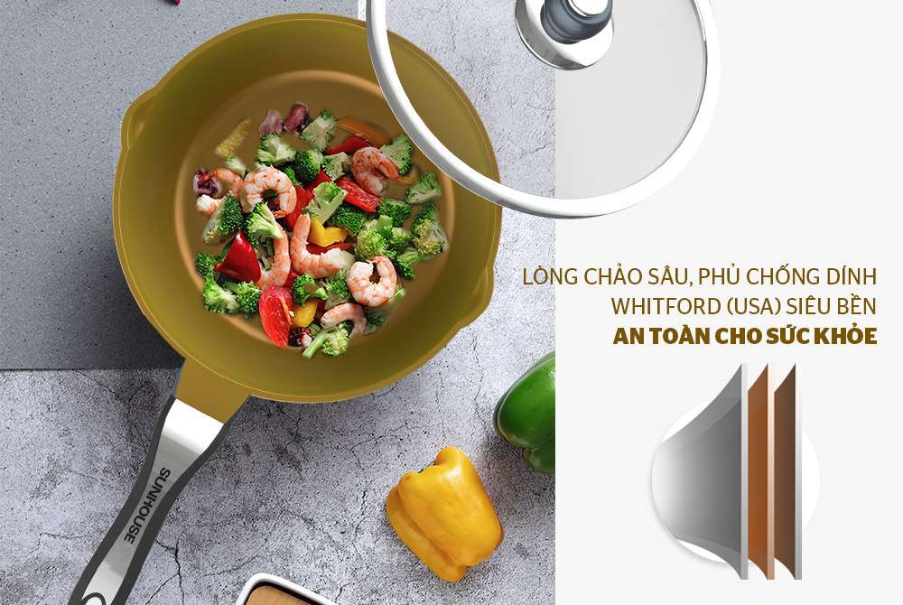 Nhóm chảo đúc siêu bền đá sâu đáy từ SUNHOUSE là dòng sản phẩm cao cấp, có thiết kế sang trọng với miệng rót độc đáo, tiện dụng. Chảo được phủ lớp chống dính Whitford (USA), kết hợp với độ sâu hợp lý đem đến giải pháp chiên, xào tuyệt vời. Chảo ứng dụng công nghệ đúc nguyên khối bền chắc, chịu va đập tốt, thích hợp tại gia đình, nhà hàng, quán ăn…