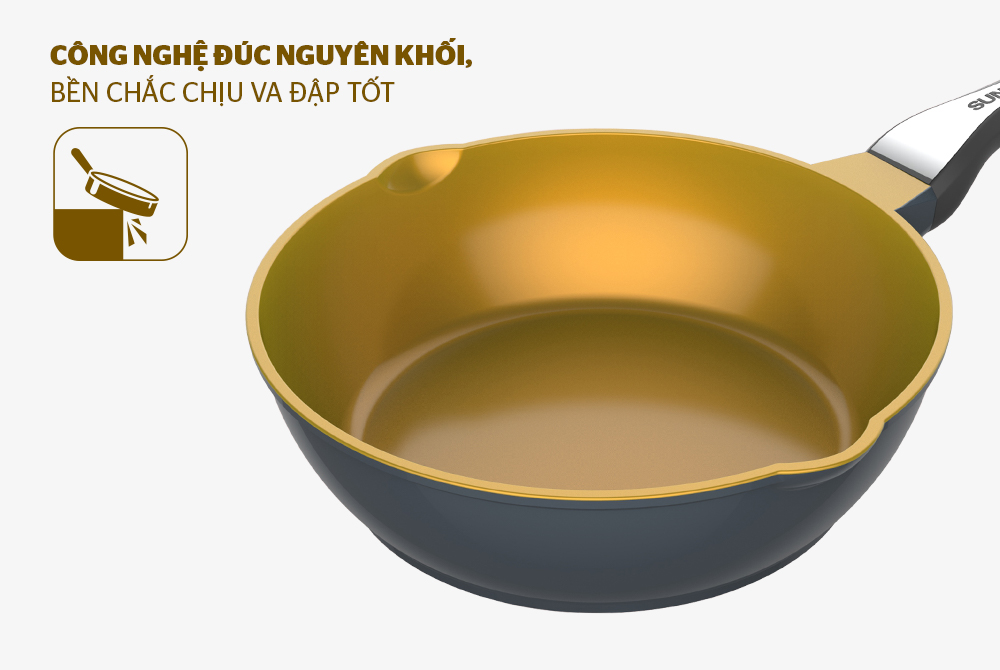 Chất liệu cao cấp: Chảo được đúc từ nhôm nguyên khối siêu bền, có khả năng chống va đập cực tốt. Chất liệu nhôm còn có khả năng dẫn nhiệt tốt, tỏa nhiệt đều giúp món chiên xào được ngon hơn.