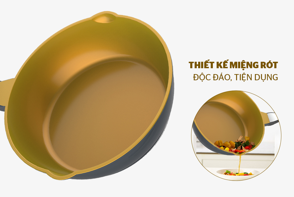 Lòng chảo sâu với thiết kế miệng rót tiện lợi: Chảo sâu 8.3cm, thích hợp để nấu cháo, súp, bột hoặc chiên rán ngập dầu. Thiết kế thêm miệng rót giúp cho việc rót các thực phẩm loãng được sạch sẽ và gọn gàng hơn.