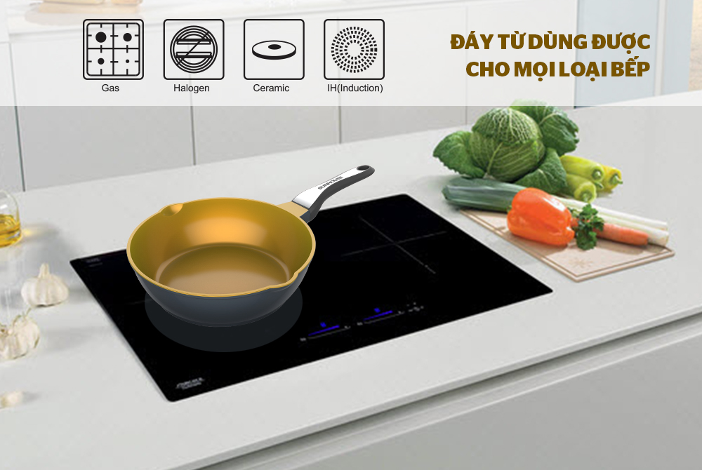 Sử dụng được trên mọi loại bếp: Chảo được cấu tạo đáy từ nên sử dụng được trên mọi loại bếp: bếp từ, bếp gas, bếp hồng ngoại.