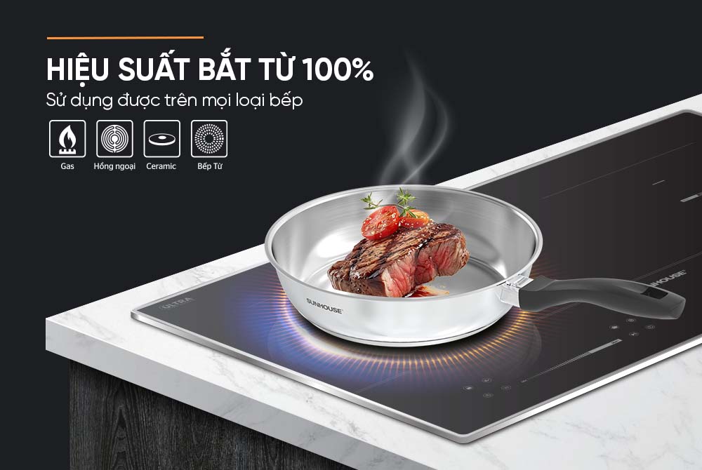 Chảo Inox Impact SUNHOUSE ECO IN28M3 có hiệu suất bắt từ tuyệt đối, có thể sử dụng trên mọi loại bếp từ bếp từ, bếp gas đến bếp hồng ngoại,…