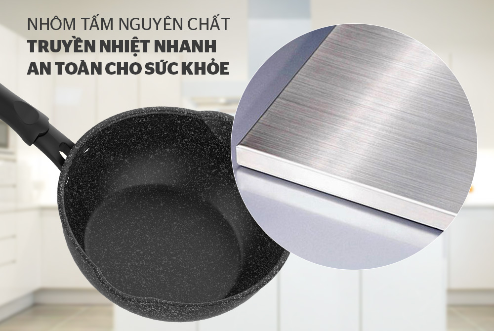 Sản phẩm được làm từ hợp kim nhôm nguyên chất cao cấp, sử dụng công nghệ sản xuất Hàn Quốc đạt tới sự bền chắc tuyệt đối. Lớp chống dính vân đá phủ trong lòng chảo giúp bạn chế trường hợp trầy xước, bám bẩn, đổi màu… cho sản phẩm luôn như mới.