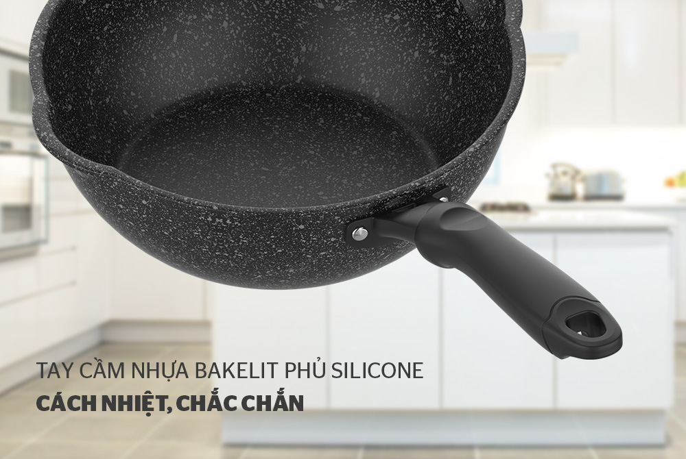 - Tay cầm bằng nhựa bakelit phủ silicone cách nhiệt, chắc chắn