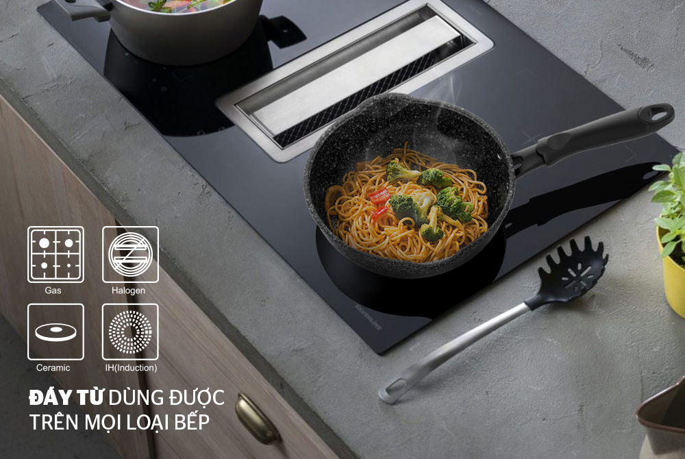 Chảo được cấu tạo đáy từ nên sử dụng được trên mọi loại bếp: bếp từ, bếp gas, bếp hồng ngoại.