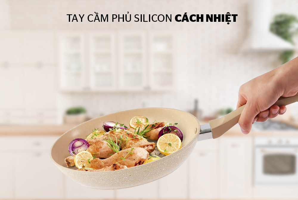 Tay cầm: Tay cầm của chảo được bọc silicon chịu nhiệt siêu bền, bắt vít chắc chắn với thân chảo giúp người dùng dễ dàng thao tác sử dụng và đảm bảo an toàn. Phía cuối tay cầm còn được thiết kế lỗ treo móc gọn gàng, tiện dụng.