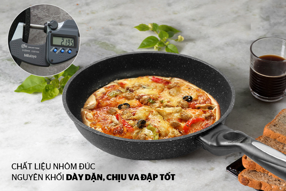 Chất liệu nhôm đúc nguyên khối bền bỉ: Chảo SBDS28 được sản xuất theo công nghệ đúc tiên tiến từ Hàn Quốc. Nhờ đó, sản phẩm có độ dày hợp lý khoảng 2.2mm, bền chắc, hạn chế tối đa móp méo khi va đập. Bên cạnh đó, lớp vân đá hoa cương tráng trên bề mặt chảo giúp tăng độ bền của lớp chống dính, hạn chế bong tróc, ngăn bám bẩn, dễ vệ sinh, giúp sản phẩm bền đẹp lâu hơn.