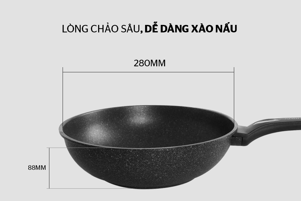 Lòng chảo sâu, dễ dàng xào nấu: Chảo siêu bền đá sâu SBDS28 có kích thước 28cm cùng chiều cao 8.8cm, giúp xào nấu được lượng thực phẩm nhiều hơn mà không lo rơi vãi khi đảo, lật, …