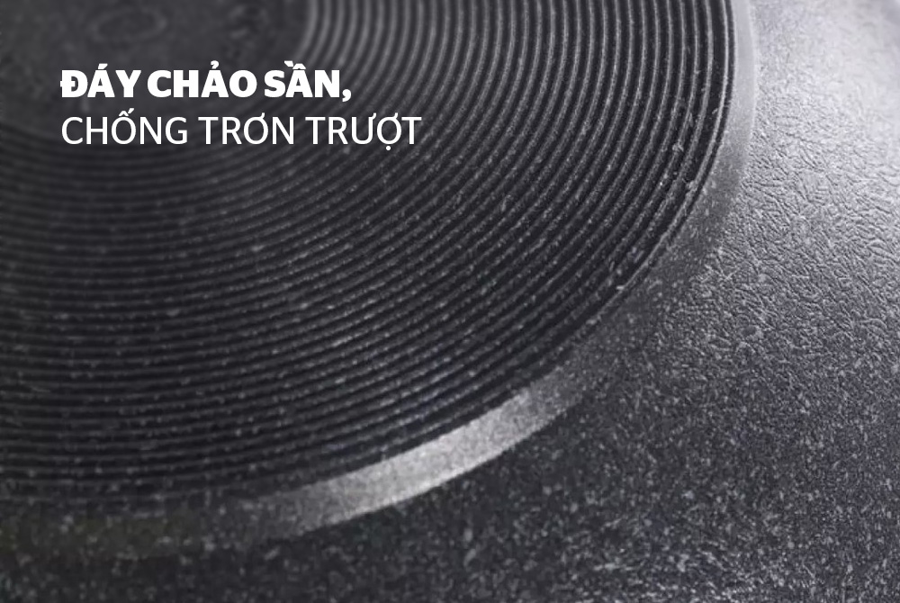 Đáy chảo sần, chống trơn trượt: Đáy chảo được thiết kế các đường vân đồng tâm sâu, chống trượt tốt, an toàn khi sử dụng.