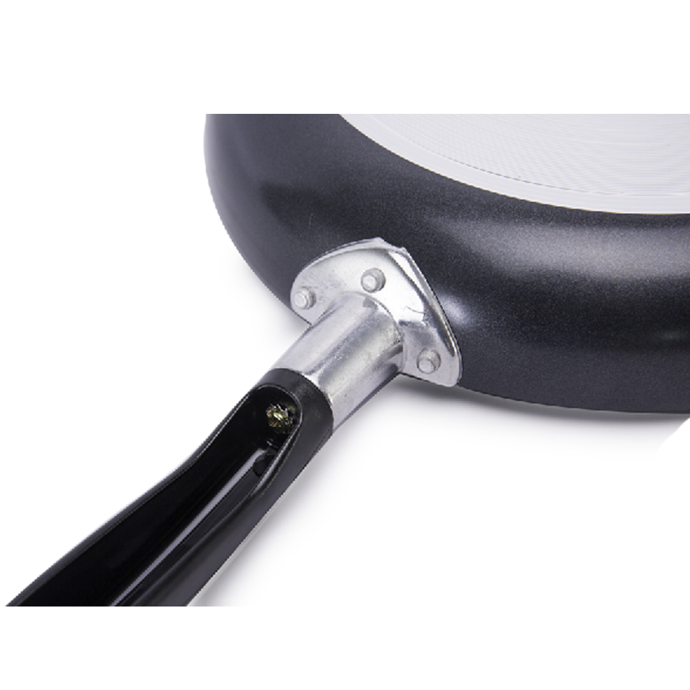 Tay cầm: Tay cầm được bắt vít chắc chắn vào thân chảo, đảm bảo an toàn trong quá trình sử dụng, nâng nhấc, di chuyển. Cán cầm bằng nhựa chịu nhiệt siêu bền có độ dài vừa phải, chống bỏng, hạn chế trơn trượt.