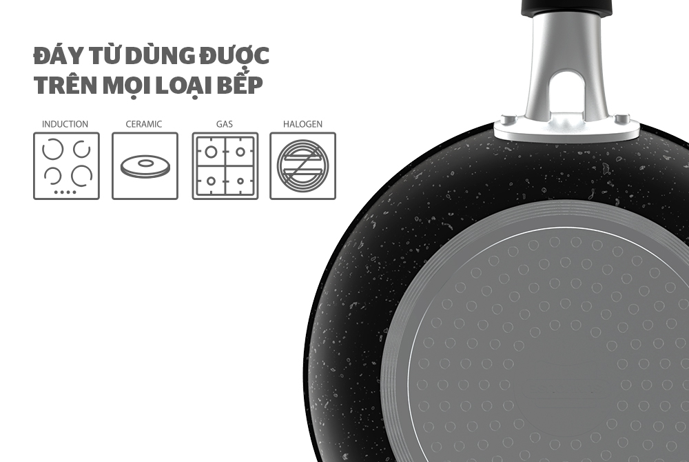 Chảo được tích hợp đáy từ, dễ dàng linh hoạt trên đa dạng các loại bếp, bao gồm bếp từ, bếp hồng ngoại, bếp gas, …