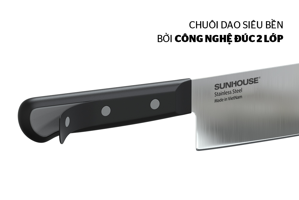 Đặc biệt, tay cầm của dao thái SUNHOUSE được thiết kế rất vừa vặn với cỡ tay trung bình của người dùng. Bề mặt chuôi nhám giảm trơn trượt, dễ cầm nắm, tăng độ an toàn trong quá trình sử dụng.