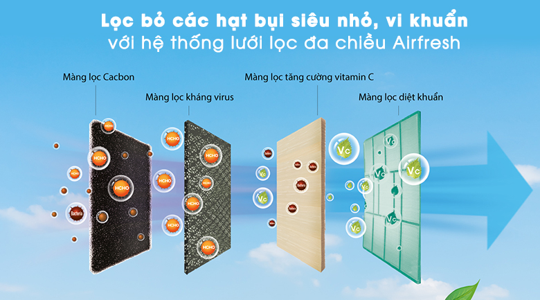 Hệ thống lưới lọc đa chiều Airfresh với 4 màn lọc là màng lọc Cacbon, màng lọc kháng virus, màng lọc tăng cường Vitamin C, màng lọc diệt khuẩn giúp loại bỏ những hạt bụi siêu nhỏ có kích thước 0.3 micromet, vi khuẩn có trong không khí bảo vệ sức khỏe của cả nhà.