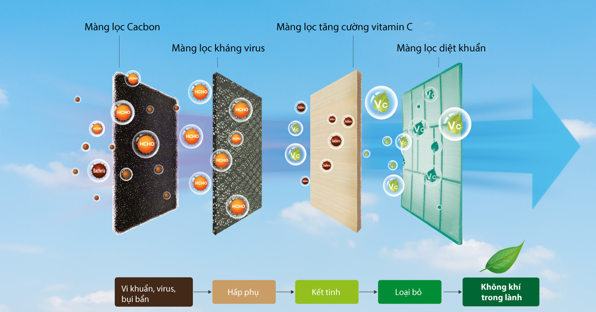 Hạt bụi nhỏ cũng như các tạp chất hữu cơ bay hơi luôn có khắp mọi nơi trong không khí. Hệ thống lưới lọc đa chiều Air Fresh giúp bắt giữ và loại bỏ bụi bẩn, vi khuẩn và các tác nhân gây hại khác mang đến bầu không khí trong lành. Hệ thống lưới với khả năng lọc các hạt bụi siêu nhỏ 0.3 micromet thông qua 4 màng lọc chính: màng lọc Cacbon, màng lọc kháng virus, màng lọc tăng cường Vitamin C, màng lọc diệt khuẩn.