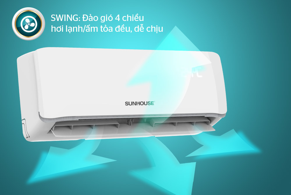 - SWING: Quạt gió với cánh hướng dòng 4 chiều, đảo gió tự động giúp khí lạnh/ hơi ấm tỏa đều khắp phòng