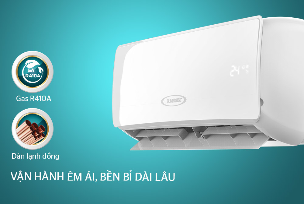 Điều hòa SUNHOUSE sử dụng dàn lạnh ống đồng và môi chất lạnh gas R410A. Nếu môi chất lạnh gas R410A đem đến hơi lạnh sâu, làm mát tức thì, thì dàn lạnh ống đồng lại có khả năng giữ nhiệt tốt, giảm rò rỉ môi chất lạnh. Nhờ đó, người dùng có thể nhanh chóng tận hưởng hơi lạnh êm ái từ điều hòa SUNHOUSE.