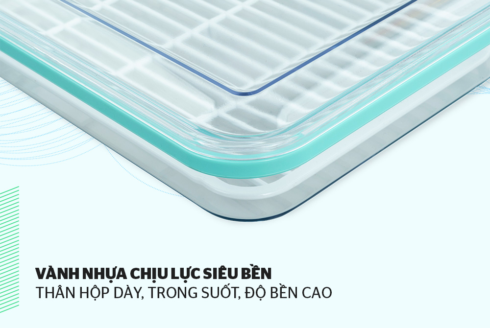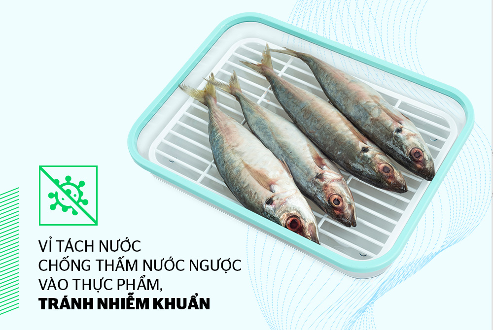 Với thiết kế vỉ tách nước tiện lợi, lượng nước còn lưu lại trong thực phẩm (thịt, cá, hải sản…) sau khi được đưa vào hộp sẽ chảy xuống lòng hộp bên dưới thay vì thấm ngược vào thực phẩm, giữ độ ẩm vừa phải. Việc này không những giúp tránh nhiễm khuẩn, biến chất thực phẩm mà việc rã đông cũng nhanh hơn do không có nhiều nước tích tụ bị làm đông.