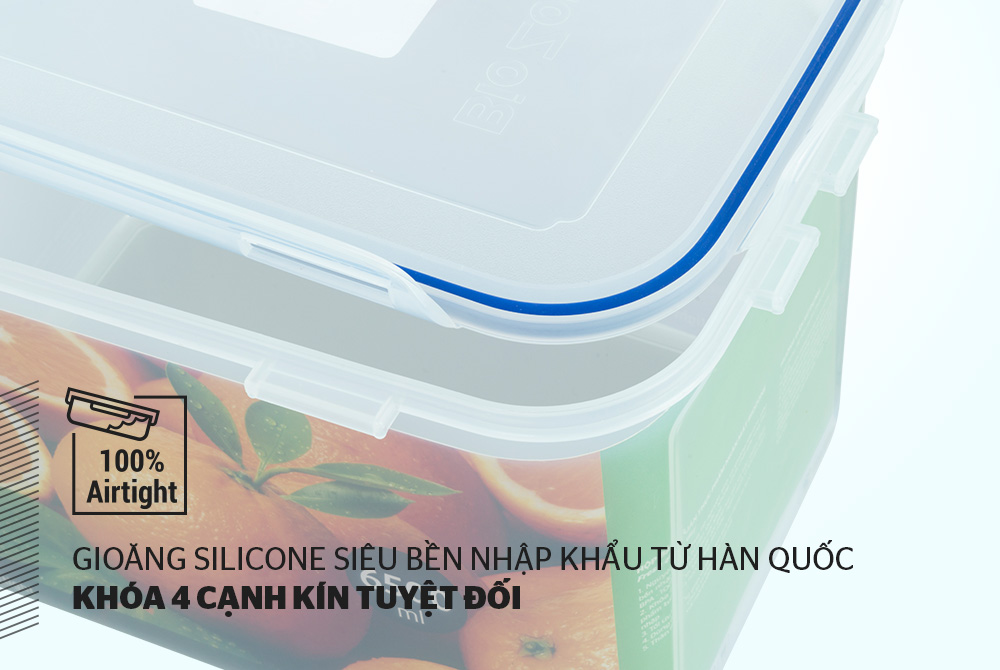 Gioăng silicon bọc quanh nắp hộp, ngăn không cho không khí tràn vào hoặc thoát ra, hạn chế quá trình oxy hóa xảy ra, thực phẩm tươi lâu hơn.