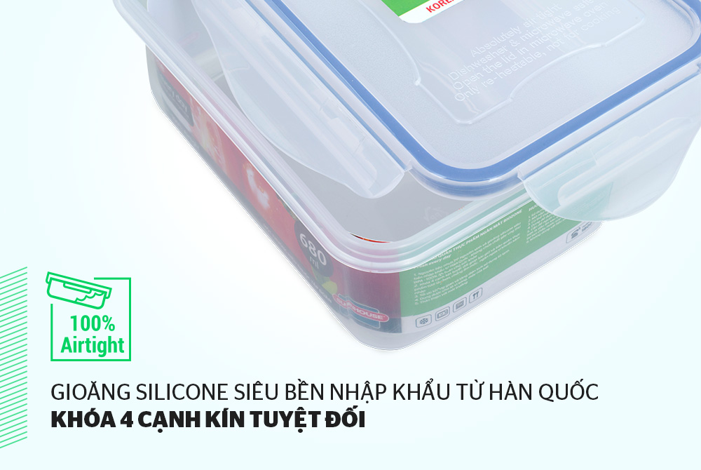 Gioăng silicon bọc quanh nắp hộp, ngăn không cho không khí tràn vào hoặc thoát ra, hạn chế quá trình oxy hóa xảy ra, thực phẩm tươi lâu hơn.