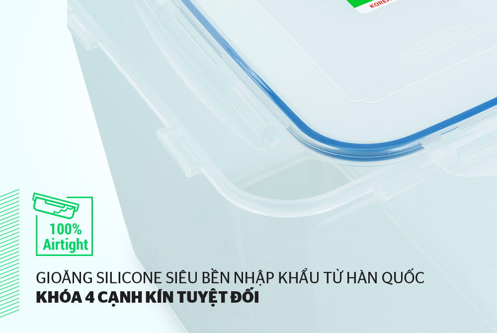 Gioăng silicon bọc quanh nắp hộp, ngăn không cho không khí tràn vào hoặc thoát ra, hạn chế quá trình oxy hóa xảy ra, thực phẩm tươi lâu hơn.