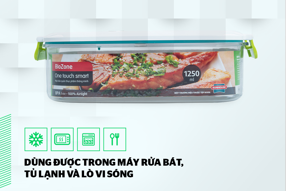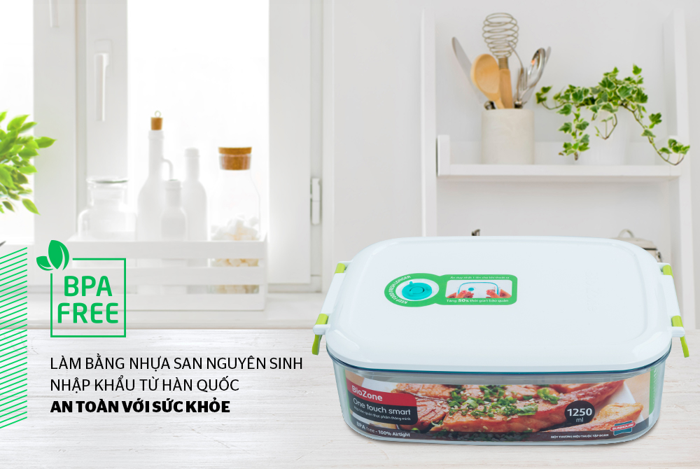 Trong đó, hộp bảo quản thực phẩm thông minh BioZone 1250ml là dòng hộp nhựa an toàn phân khúc cao cấp được làm từ nguyên liệu nhựa nguyên sinh, an toàn với sức khỏe, đáp ứng nhu cầu bảo quản thực phẩm đa dạng tại gia đình.